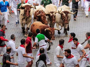 Pamplona: A fighting bull gored two men and spread panic in a hair-raising final running of the bulls at Spain’s San Fermin festival Monday. Hundreds of people dashed alongside the six half-ton beasts and their accompanying steer through the cobblestone streets of Pamplona in the eighth run. There were spine-chilling moments when one bull separated from the pack and charged three runners, pinning them against walls and barriers while trying to gore them. [caption id=“attachment_1618253” align=“alignleft” width=“380”]