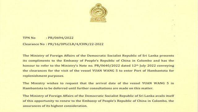 In a letter accessed by CNN-News18, Sri Lankan authorities have sought deferment of the ship’s arrival “till further consultations”.