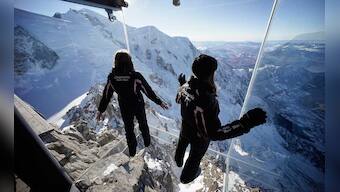 A man, wearing slippers to protect the glass floor, stands in the 'Step into the Void' installation during a press visit at the Aiguille du Midi mountain peak above Chamonix, in the French Alps, REUTERS