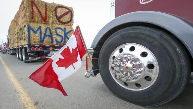 Toronto: In a scene at odds with Canadians’ reputation for niceness and rule-following, thousands of protesters railing against vaccine mandates and other COVID-19 restrictions descended on the capital over the weekend, deliberately blocking traffic around Parliament Hill. Some urinated and parked on the National War Memorial. One danced on the Tomb of the Unknown Soldier. A number carried signs and flags with swastikas. In the aftermath of Canada’s biggest pandemic protest to date, the demonstrators have found little sympathy in a country where more than 80 per cent are vaccinated. Many people were outraged by some of the crude behaviour. Prime Minister Justin Trudeau called the Ottawa protesters a “fringe minority” and said they reflected the proliferation of “disinformation and misinformation online, conspiracy theorists, about microchips, about God knows what else that go with the tinfoil hats.” Organisers, including one who has espoused white supremacist views, had raised millions for the cross-country “freedom truck convoy” against vaccine mandates. It attracted support from former US president Donald Trump and Tesla billionaire Elon Musk. Trudeau and his family were moved to an undisclosed location during the protest. {Two of his children tested positive for COVID-19, and a test Monday revealed he, too, was infected. He said he is fine and working remotely.} Please read: Why India must support protesting Canadian truckers against Justin Trudeau A smaller but still significant number of protesters remained on the streets on Tuesday, saying they won’t leave until all vaccine mandates and other restrictions are gone. They are also calling for the removal of Trudeau’s government, though it is responsible for few of the measures, most of which were put in place by provincial governments. “It’s time for Canada and the rest of the world to find other ways to deal with this virus,” said protester Michelle Kloet, 47, of Canmore, Alberta. [caption id=“attachment_10340991” align=“alignnone” width=“640”]  The Canadian flag is reflected in a wheel hub as anti-COVID-19 vaccine mandate demonstrators gather as a truck convoy blocks the highway at the busy US border crossing in Coutts, Alberta, Canada. AP[/caption] During the demonstration, the statue of Terry Fox, a national hero who lost a leg to bone cancer as a youngster and set off in 1980 on a fundraising trek across Canada, was draped with an upside-down Canadian flag and a sign that read “Mandate freedom.” “My kids were shocked. Like all Canadian young people, they have grown up with Terry Fox as a hero,” Deputy Prime Minister Chrystia Freeland said. “This is not the Canada who we want to be. And I really proudly believe, and I know, this is not what Canada is.” Ontario Premier Doug Ford said he was “extremely disturbed” to see people “desecrate our most sacred monuments and wave swastikas and other symbols of hate and intolerance.” The outburst was seen as so out of character for Canada that one US scientist felt compelled to apologise for what he portrayed as America’s influence. “Canada gave us kindness, tolerance, poutine and hockey, and in turn we exported this awful fake health freedom movement linked to far right extremism that caused so much senseless loss of life in America and now might do the same there,” tweeted Dr Peter Hotez, an infectious-disease specialist at the Baylor College of Medicine in Texas. “Our apologies.” Many of the demonstrators refused to wear masks in hotels, malls and grocery stores. One homeless shelter reported protesters had demanded it feed them. Ottawa Police Chief Peter Sloly said several investigations are underway and a tip line for hate crimes, threats and assaults related to the demonstration has been set up. Sloly said one person had been arrested in connection with the protest. Tim Abray, a PhD candidate, said he was assaulted by “so-called freedom fighters” while taking pictures of the protest in his neighbourhood. The most visible contingent of protesters were truck drivers who parked their big rigs on Parliament Hill. Some of them were protesting a rule that took effect on 15 January requiring truckers entering Canada to be fully immunised against the coronavirus. The Canadian Trucking Alliance has estimated that 85 per cent of truckers in Canada are vaccinated. Meanwhile, police on Tuesday moved to end a protest convoy of trucks and other vehicles that had been blocking a major US border crossing in Coutts, Alberta, since Saturday. It turned violent after some protesters breached police barriers to join the demonstration, authorities said. “I’ve received reports in the last hour of people aligned with the protesters assaulting RCMP officers, including one instance trying to ram members of the RCMP, later leading to a collision with a civilian vehicle,” Alberta Premier Jason Kenney. “This kind of conduct is totally unacceptable. Without hesitation, I condemn those actions and I call for calm.” Some opposition Conservative lawmakers attended the protest in Ottawa, and Conservative Party leader Erin O’Toole, who is facing a revolt among his lawmakers, met with some of the truckers. Phil Haggart, a counter-protester, said he was there to show that there are voices in favor of public health measures. “Masks are important, vaccines are important, and mandates are important only because we need them to stay alive and not fill our hospitals up,” he said. A surge of the highly contagious omicron variant has led to record cases and lockdowns in Ontario and Quebec, Canada’s most populous provinces. Vaccine mandates imposed by the provincial governments remain in place. But restaurants reopened Monday with 50 per cent capacity, and Quebec’s premier, Francois Legault, announced Tuesday he is abandoning his threat to tax the unvaccinated, saying the proposal has divided Quebecers. “I have to protect the health of 