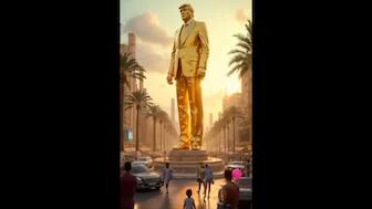 The video shows beaches, giant golden statues of Trump reminding you of British monarchs, and malls selling golden miniatures of Trump, amid dancers performing with Trump. The video starts with the view of Gaza devastated in the Israel-Hamas War and then shows skyscrapers.
