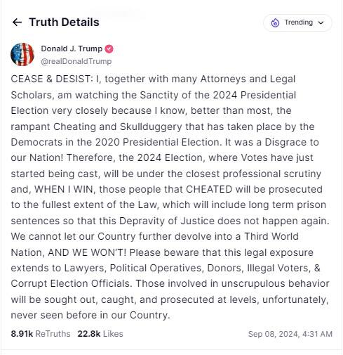 While reiterating his false claims that the 2020 US Presidential Election was stolen, former US President Donald Trump unleashed lethal warnings against anyone who engages in “unscrupulous behaviour” during the 2024 race results. Trump issued the threat in a post on TruthSocial. The former President accused Democrats of “rampant Cheating and Skullduggery” and said that he would imprison anyone who engages in “malicious behavior” during the November polls.