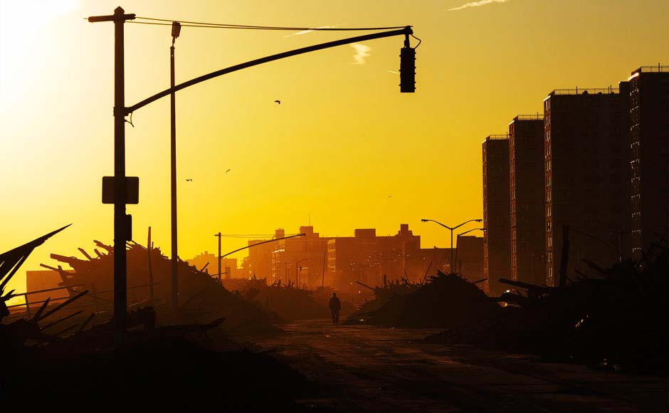 A man walks down Shore Front Parkway surrounded by debris pushed onto the streets by hurricane Sandy in the Queens borough region of the Rockaways in New York, 6 November, 2012. Lucas Jackson/Reuters
