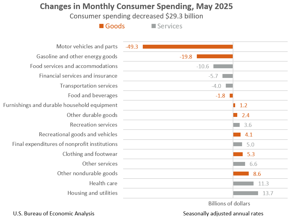 The 50 per cent drop-off in motor vehicle sales in May was a significant driver of the overall spending retreat. The vehicle industry saw a sharp decline in May because consumers rushed to dealerships to buy cars in March and April, fearing that President Donald Trump’s tariffs would send those costs soaring.