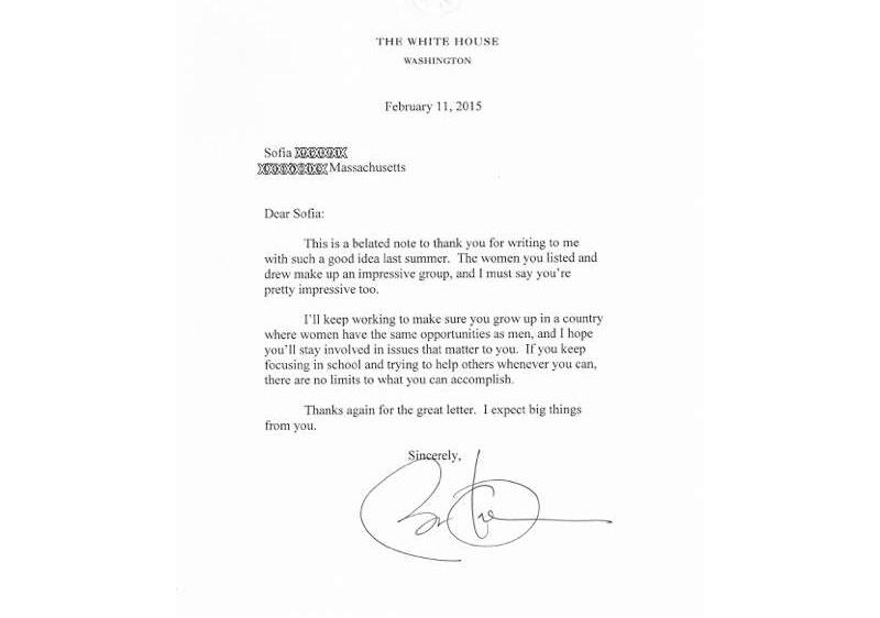 The President said, “A young girl wrote to ask me why aren’t there any women on our currency, and then she gave me like a long list of possible women to put on our dollar bills and quarters and stuff – which I thought was a pretty good idea.” And in his reply Obama said would keep working to make sure the she grew up in a country where women have the same opportunities as men. Here’s the letter: