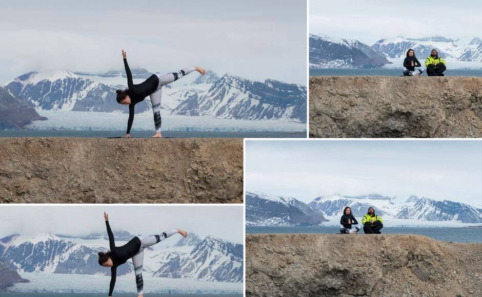Yoga reaches new heights as enthusiasts practice yoga the the backdrop of the Kongsvegen glacier, Norway. twitter.com/MEAIndia[/caption]