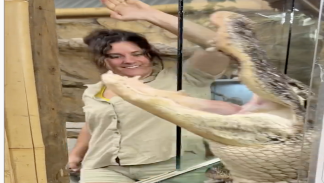 Most of us would scream to the top of our lungs if a hungry alligator aggressively attempts to even come near us. But this zookeeper’s reaction to the reptile will leave you shocked. The woman was captured laughing when the reptile tried to attack her. In a video posted on Instagram, the zookeeper can be seen behaving nonchalantly despite the threat from the gator. She asks an alligator if it’s hungry, and it makes a hissing sound. Completely unbothered, she then opens the glass enclosure a little bit. After this, the alligator aggressively tries to jump on her. But she laughs it off and handles the reptile like a professional. The video was shared by the Instagram account of “The Reptile Zoo”.
